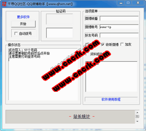 基本功能: 1.批量自動導入號碼 2.批量登錄號碼【需打碼】 3.批量收聽微博聽眾 4.批量轉播微博廣播 5.批量加好友 6.批量修改微博資料