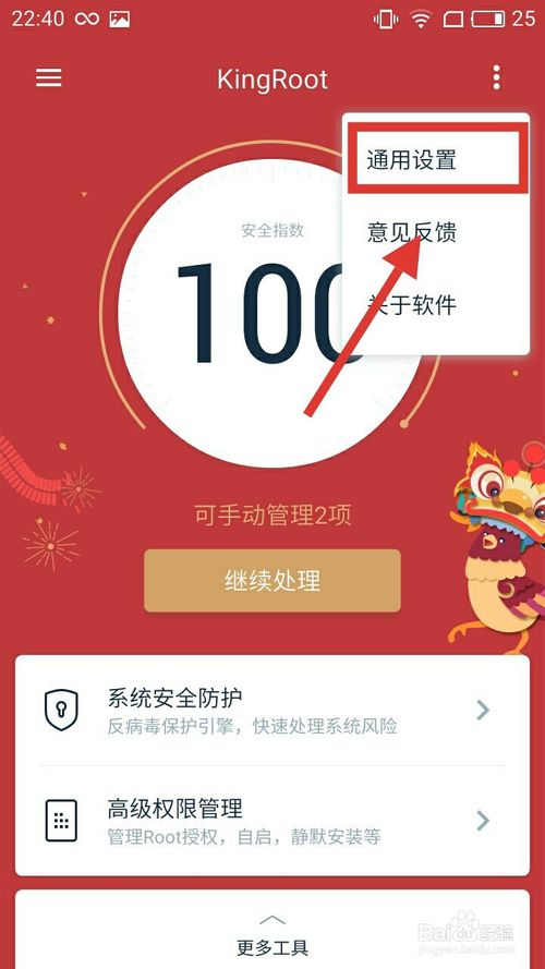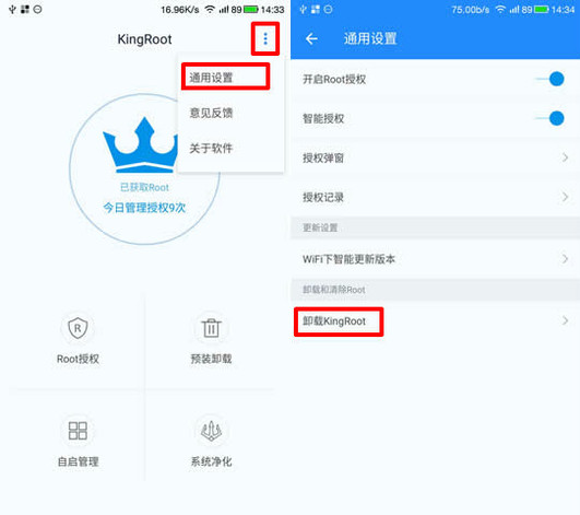 4、點擊右上角圖標,點擊通用設置。找到卸載Kingroot,并點擊。