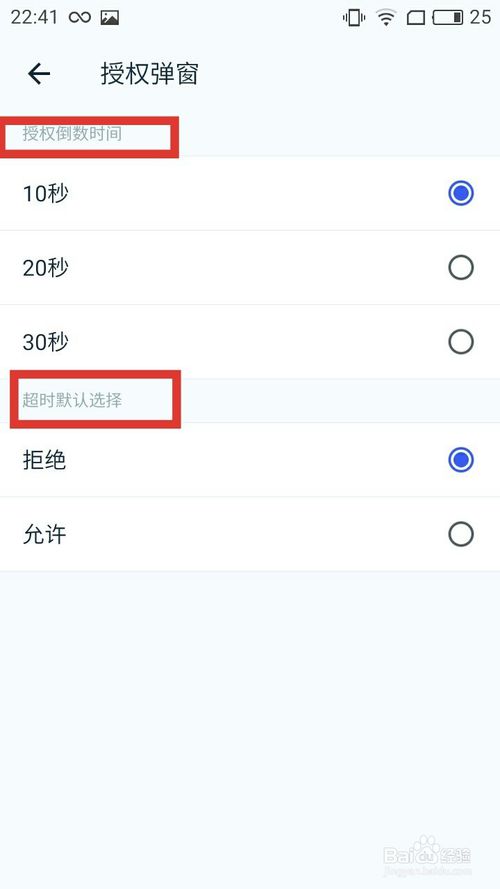4、在授權彈窗里面可設置“授權倒數(shù)時間”和“授權默認選擇”。建議授權倒數(shù)時間設置為“20秒”,授權默認選擇為“拒絕”。允許應用授權前,建議檢測手機應用的安全性。
