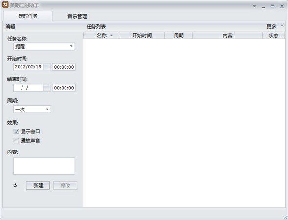 美明定時(shí)助手是一款功能全面、操作簡(jiǎn)便的定時(shí)工具。美明定時(shí)助手用于創(chuàng)建各種定時(shí)任務(wù),如提醒、打開(kāi)文檔、運(yùn)行程序、播放音樂(lè)、待機(jī)、關(guān)機(jī)等,支持一次、每天、每周、每月、每年以及自定義循環(huán)時(shí)間.美明定時(shí)助手具備有效時(shí)間檢測(cè)機(jī)制,讓您不再錯(cuò)過(guò)重要的工作和事情。