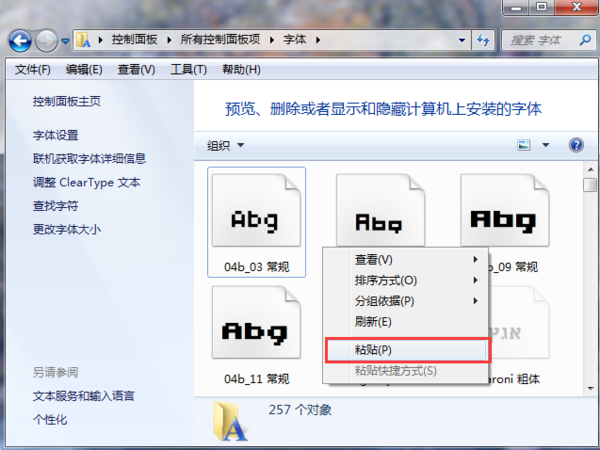 4、把下載解壓的字體文件粘貼進“字體”文件夾就能完成安裝。