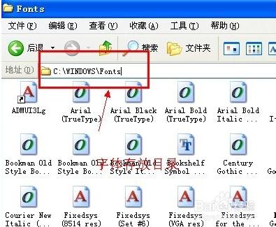 3、然后打開系統(tǒng)的字體庫文件夾“C:\WINDOWS\Fonts”這個文件夾