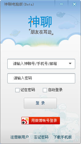神聊電腦版把手機(jī)上已經(jīng)深入人心的"按住對(duì)講"功能經(jīng)過(guò)精心設(shè)計(jì),移植到電腦上,為用戶(hù)在電腦上使用語(yǔ)音對(duì)講功能帶來(lái)方便。電腦用戶(hù)也可以象手機(jī)用戶(hù)一樣,使用方便的對(duì)講功能,而且支持電腦和手機(jī)互通:電腦用戶(hù)可以發(fā)給手機(jī)用戶(hù),手機(jī)用戶(hù)也可以發(fā)給電腦用戶(hù)。神聊電腦版的主要功能由六個(gè)模塊組成。分別是好友,群組,最近聯(lián)系,找好友,好友管家,及設(shè)置模塊。支持新浪微博賬號(hào)直接登錄。