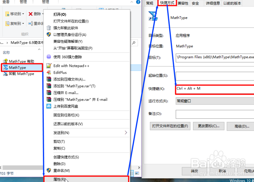 找MathType圖標(biāo),右鍵》打開文件所在位置》文件中圖標(biāo)上右鍵》屬性》快捷鍵》輸入自定義快捷鍵。