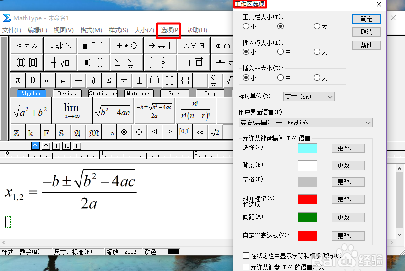 打開MathType應(yīng)用,設(shè)置編輯頁面,根據(jù)個人習(xí)慣調(diào)整工作區(qū)界面,這樣便于編輯和查看公式。