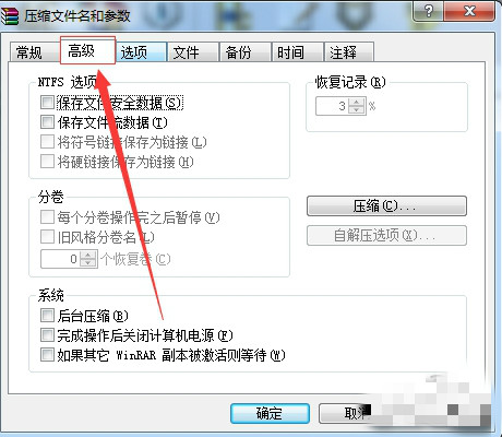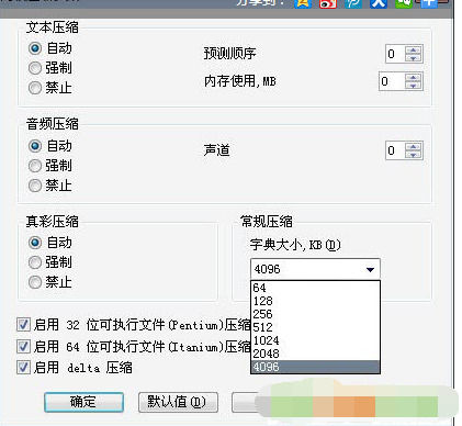 在“高級(jí)”標(biāo)簽中點(diǎn)擊“壓縮”按鈕,打開“高級(jí)壓縮參數(shù)”設(shè)置。將“常規(guī)壓縮”選項(xiàng)中的字典大小選擇更大的數(shù)值。