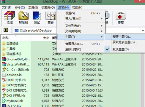 主題皮膚安裝完成后,我們?cè)俅位氐絎inRAR的主界面,點(diǎn)擊菜單“選項(xiàng)”-“主題”-“整理主題...”。
