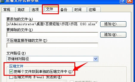 在彈出的對(duì)話框中,切換到“文件”標(biāo)簽,勾選“把每個(gè)文件放到單獨(dú)的壓縮文件中”。