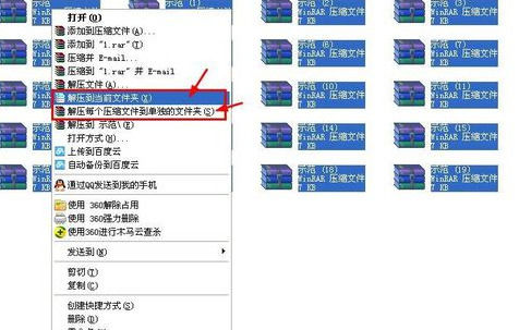 下面示范怎樣將許多的壓縮文件批量自動(dòng)解壓。全選需要解壓的文件,按鼠標(biāo)右鍵,選擇“解壓到當(dāng)前文件夾”,或者“解壓每個(gè)壓縮文件到單獨(dú)的文件夾”,這兩個(gè)選項(xiàng)都可以,不信你試試。