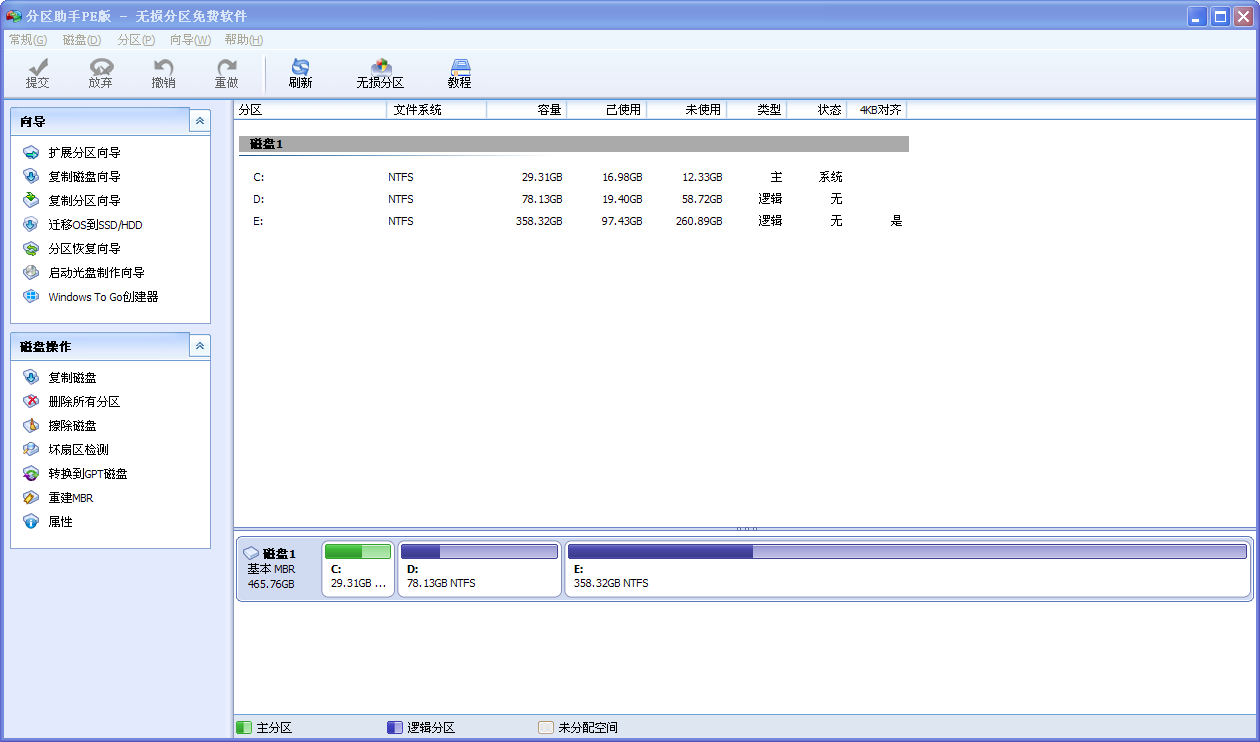 分區(qū)助手WinPE專用版適合在WinPE2.x, WinPE 3.x and all WinPEs環(huán)境中運(yùn)行,比如大白菜PE工具箱、通用PE工具箱等,其具有磁盤(pán)分區(qū)、拷貝、遷移、恢復(fù)及刪除系統(tǒng)、引導(dǎo)系統(tǒng)分區(qū)等管理功能。