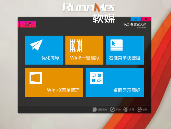 win8優(yōu)化大師是一款專門針對(duì)Win8的系統(tǒng)優(yōu)化工具軟件,win8優(yōu)化大師支持32位和64位的Windows 8 操作系統(tǒng),特別提供Win+X菜單定制、神奇的桌面右鍵菜單快捷組、輕松找回Win8開(kāi)始按鈕和開(kāi)始菜單,讓你的Win8更極速、更漂亮、更穩(wěn)定、更安全。