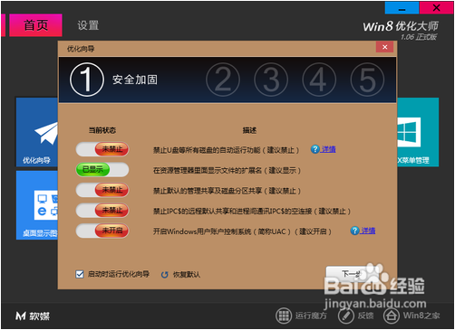 1、安裝好打開(kāi)win8優(yōu)化大師,這時(shí)會(huì)自動(dòng)彈出優(yōu)化向?qū)?,找到你需要?yōu)化的功能,點(diǎn)擊禁用或者啟動(dòng)即可。