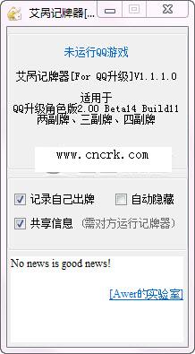 艾咼QQ升級記牌器 V1.0綠色免費(fèi)版 艾咼QQ升級記牌器[For QQ升級]為QQ升級游戲的輔助工具,能夠幫助玩家記錄各家出過的牌,統(tǒng)計尚未出現(xiàn)過的牌以及玩家手中缺少的花色。