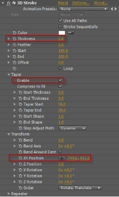 圖2(2) 對(duì)Solid層添加3DStroke特效,設(shè)置Thickness的值為5,展開(kāi)Taper屬性,勾選Enable,展開(kāi)Transform屬性,設(shè)置XYPosition的值為744,801,如圖3所示。