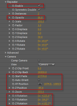 圖3(3) 展開(kāi)Repeater屬性,勾選Enable,設(shè)置Opacity的值為86,展開(kāi)Camera屬性,設(shè)置StartFade的值為27770,XYPosition的值為1074,1009.5,ZPosition的值為-85.6,設(shè)置XRotation的值為0x+225,YRotation的值為0x-54,ZRotation的值為0x+102.7,如圖4所示。