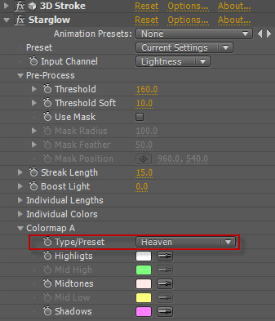 圖4(4) 繼續(xù)添加Starglow特效,設(shè)置ColormapA屬性里Type/Presets為Heaven,如圖5所示。