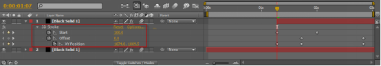 圖5(5) 移動(dòng)時(shí)間標(biāo)簽至00:02位置處,設(shè)置3DStroke特效里Start和XYPosition的關(guān)鍵楨,移動(dòng)時(shí)間標(biāo)簽至00:13位置處,設(shè)置Offset的關(guān)鍵楨,設(shè)置XYPosition的值為1077,477,移動(dòng)時(shí)間標(biāo)簽至00:20位置處,設(shè)置Start的值為0,移動(dòng)時(shí)間標(biāo)簽至01:16位置處,設(shè)置Offset的值為-100,XYPosition的值為261,933,如圖6所示。