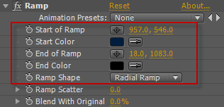 圖7(7) 新創(chuàng)建個(gè)工程,設(shè)置Name為“最”,其他設(shè)置同步驟(1)。新創(chuàng)建個(gè)Solid層,添加Ramp特效,設(shè)置StartofRamp和EndofRamp的值分別為957,546、18,1083,設(shè)置RampShape的類(lèi)型為RadialRamp,設(shè)置StartColor和EndColor的顏色如圖8所示。