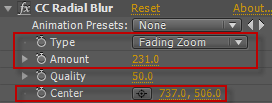 圖10(10) 選中“文字”圖層,按Ctrl+D復(fù)制出兩層,選中其中的一層,添加CCRadialBlur特效,設(shè)置Type為FadingZoom,設(shè)置Amount的值為231,Center的值為737,506,如圖11所示。
