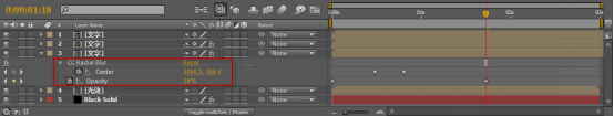 (13) 移動(dòng)時(shí)間標(biāo)簽至00:00位置處,設(shè)置Opacity的關(guān)鍵楨,其值為0%,移動(dòng)時(shí)間標(biāo)簽至00:12位置處,設(shè)置CCRadialBlur特效里Center的關(guān)鍵楨,移動(dòng)時(shí)間標(biāo)簽至00:20位置處,設(shè)置Center的值為1157,509,移動(dòng)時(shí)間標(biāo)簽至01:18位置處,設(shè)置Opacity的值為38%,如圖13所示。