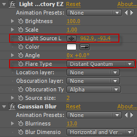 圖13(14) 新創(chuàng)建個(gè)Solid層,添加LightFactoryEZ和GaussianBlur特效,設(shè)置LightSourceLocation的值為962.9,-93.4,設(shè)置FlareType為DistantQuantum,展開(kāi)GaussianBlur特效,設(shè)置Blurriness的值為13,如圖14所示。
