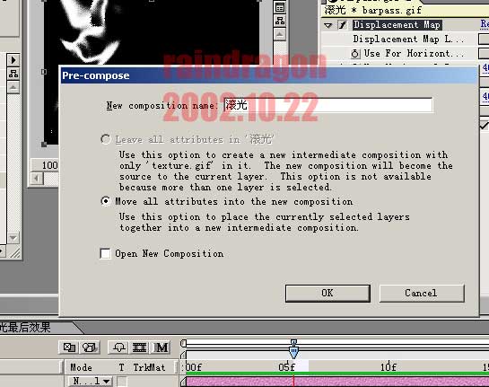 選擇上面timeline中的texture.gif和barpass.gif這兩個(gè)圖層,將其預(yù)編Pre_compose,并命名為滾光。見(jiàn)圖。