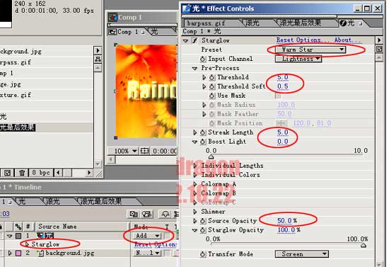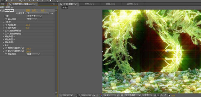 下面就接近完工了。新建一個(gè)comp。將光comp和background.gif導(dǎo)入,并讓光comp在頂層。對(duì)該層添加starglow效果。