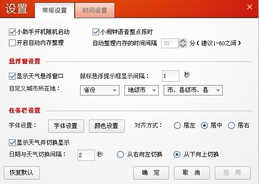 魔方小助手是個很有趣的電腦工具,極具創(chuàng)意的是它的開發(fā)技術,直接監(jiān)管了Windows右下角的時間區(qū)域。有了它,大家可以隨心所欲的定制任務欄的時間顯示,更加入農(nóng)歷(黃歷)、天氣預報、我的IP、小鬧鐘日程提醒、秒表跑表、倒計時、內(nèi)存自動整理等溫馨功能,讓屏幕右下角不再孤單。魔方小助手接管了Windows(同時支持XP、Vista、Win7等)操作系統(tǒng)的時間顯示,進行了大幅度的增強,大家體驗一下吧,是個非常有創(chuàng)新意義的小軟件。