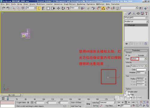 創(chuàng)建主光源在頂視圖中創(chuàng)建VRlight球形燈光,那么這盞燈光將用來(lái)模擬太陽(yáng)光。燈光的位置應(yīng)盡可能的讓光線斜著投射進(jìn)場(chǎng)景,最終使攝像機(jī)視角得到比較滿(mǎn)意的光影效果。燈光的各個(gè)參數(shù)暫時(shí)保持為默認(rèn)。