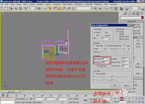 燈光方位確定之后,下面開(kāi)始創(chuàng)建此燈光的運(yùn)動(dòng)路徑。首先將時(shí)間軸的范圍調(diào)整為60幀到180幀,這樣處理是為了更清楚的識(shí)別具體時(shí)間,表示我們將要處理從早上6點(diǎn)到晚上18點(diǎn)的一段燈光動(dòng)畫(huà),60幀對(duì)應(yīng)著早上6點(diǎn),180幀對(duì)應(yīng)著晚上18點(diǎn)。