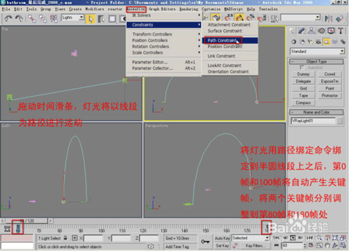 創(chuàng)建一個(gè)半圓線段。這條半圓線段我們將把它作為太陽(yáng)從東至西的運(yùn)動(dòng)軌跡。半圓線段的位置,應(yīng)盡可能使燈光在運(yùn)動(dòng)時(shí)都能讓場(chǎng)景獲得比較理想的投影效果。使用Path Constraint路徑綁定,將前面創(chuàng)建VR球形燈綁定到半圓上。并將燈光產(chǎn)生的起始和終止關(guān)鍵幀分別調(diào)整到60幀和180幀位置。通過(guò)拖動(dòng)時(shí)間滑塊,燈光將在60到180幀之間進(jìn)行運(yùn)動(dòng)。運(yùn)動(dòng)到第80幀位置,燈光就相應(yīng)的處在8點(diǎn)鐘的方向;運(yùn)動(dòng)到第150幀位置,那么燈光就位于下午3點(diǎn)鐘方向,依此類(lèi)推。
