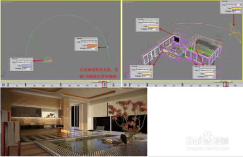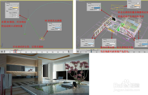 幾個(gè)關(guān)鍵時(shí)刻的效果調(diào)試完畢并記錄關(guān)鍵幀之后,那么每?jī)蓚€(gè)關(guān)鍵幀之間,燈光的顏色、強(qiáng)度和位置會(huì)產(chǎn)生逐漸的過(guò)渡變化,通過(guò)渲染,最終可以形成每一時(shí)刻的光照效果。這期間每個(gè)時(shí)段的效果均可以按照以上方式來(lái)一一進(jìn)行動(dòng)畫(huà)定義,以獲得更精確的時(shí)間顏色和強(qiáng)度。
