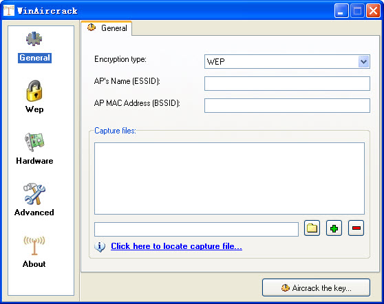 (5)點擊左側(cè)的“General”進行設(shè)置,選擇加密類型為“WEP”,添加捕獲的文件(testwep.ivs)。
