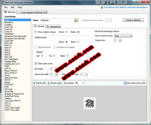 條形碼生成工具(Bytescout BarCode Generator) 3.2.0.590 官方版 條形碼生成工具能夠生成和導(dǎo)出成圖片(PNG,JPG格式,TIFF,GIF)的條碼。支持一維條碼類型:庫德巴碼,交叉39碼,2,5,將UPC-E,POSTNET,UPC-A的93碼,128碼,EAN-13,EAN-8,一月-13的Bookland。支持的二維條碼類型:PDF417碼,截斷的PDF417,DataMatrix二維碼,QR碼。采取Bytescout條碼生成器試駕看到多么有用,它可以為你!