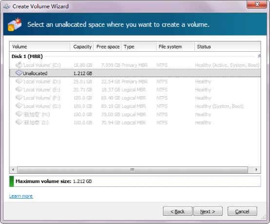 前提是你硬盤上要有未分區(qū)空間(Unallocated),點(diǎn)擊Unallocated分區(qū),右鍵選擇Create volume.