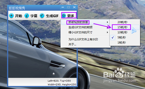 然后我現(xiàn)預(yù)設(shè)一下,點(diǎn)擊“更多”按鍵,選擇“抓取視頻的頻率”---“15幀/秒”(這個數(shù)值越大,GIF錄制的越完整)