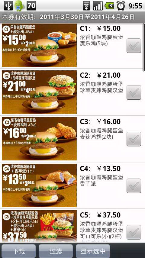 優(yōu)惠券裝入手機(jī),去麥當(dāng)勞隨時有優(yōu)惠。這是最實(shí)用的麥當(dāng)勞優(yōu)惠券軟件,不論你在全國哪一家麥當(dāng)勞門店(機(jī)場、火車站店等特殊門店除外),都可使用手機(jī)上的優(yōu)惠券直接打折,與傳統(tǒng)紙質(zhì)券同享折扣。