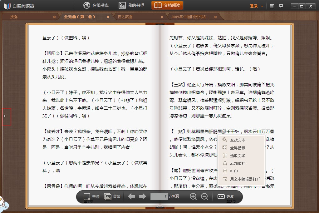 百度閱讀器體積小、速度快,支持PDF及TXT兩種格式,更能提供全屏或翻書的閱讀模式和多種閱讀背景。有各類閱讀輔助工具,如復(fù)制、截圖、查找等。