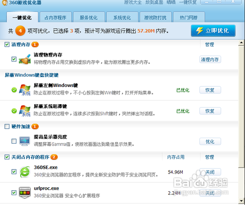 1.一鍵優(yōu)化1、清理內(nèi)存 2、屏蔽Windows鍵盤快捷鍵 3、硬件加速 4、關(guān)閉占內(nèi)存的程序