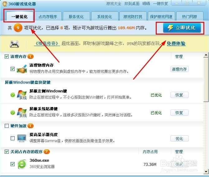 單擊打開游戲優(yōu)化器,所有功能就映入我們的眼簾了。我們可以直接選擇一鍵優(yōu)化,然后點(diǎn)擊右側(cè)的立即優(yōu)化。