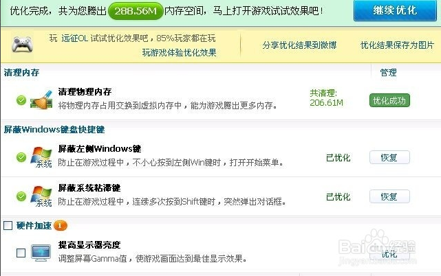 還有最后一點(diǎn)就是,右擊在屏幕下方的游戲優(yōu)化器圖標(biāo)是,會(huì)顯示出四個(gè)功能,其中的硬件加速,屏蔽快捷鍵,清理內(nèi)存?zhèn)€人覺得還不錯(cuò),根據(jù)個(gè)人需要可以使用下。