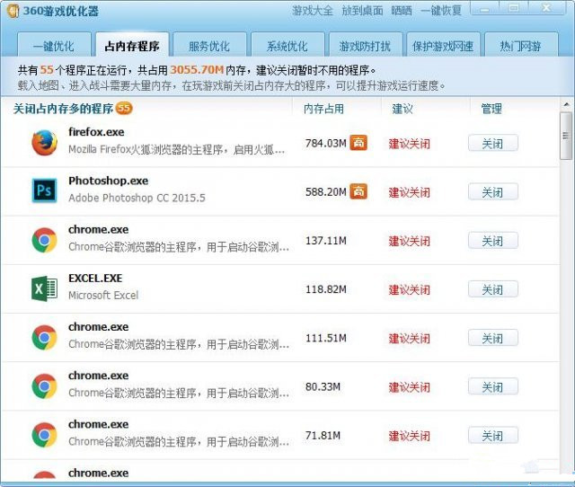 360安全衛(wèi)士的游戲優(yōu)化器好用嗎?對(duì)提高 你的游戲流暢性 還是有一定效果的,其具體功能就是為您的系統(tǒng)減負(fù),釋放被占用的內(nèi)存,保護(hù)網(wǎng)速,暫停關(guān)閉游戲中用不上的系統(tǒng)服務(wù)(只是暫時(shí)關(guān)閉,并非永久關(guān)閉),從而達(dá)到為游戲提速的目的。