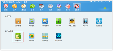 第一步:用USB數(shù)據(jù)線將手機(jī)與電腦連接,打開(kāi)騰訊手機(jī)管家PC版點(diǎn)擊工具箱找到一鍵Root。