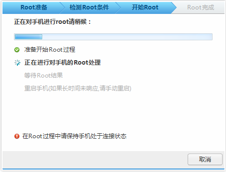 第四步:點(diǎn)擊開(kāi)始Root,整個(gè)過(guò)程會(huì)重啟2次手機(jī)耗時(shí)約2-3分鐘。