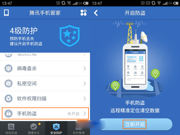 第一步:在手機(jī)還沒(méi)被盜之前,我們需要安裝”騰訊手機(jī)管家“,不然誰(shuí)也追蹤不到手機(jī)了。打開(kāi)“騰訊手機(jī)管家”在底部欄中選擇“安全防護(hù)”。在安全防護(hù)里,我們能看到“手機(jī)防盜”的選項(xiàng)。