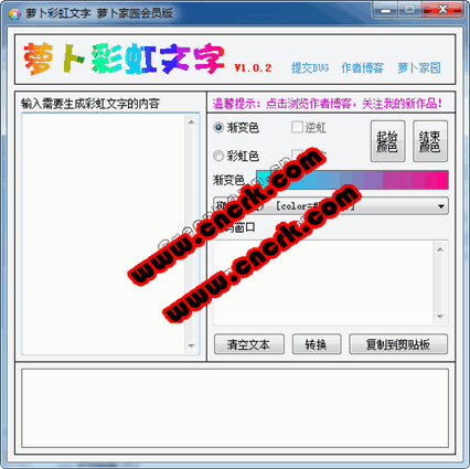 由于時(shí)間倉(cāng)促,蘿卜彩虹文字做好了基本功能以后就發(fā)布了,沒(méi)有來(lái)得及做蘿卜彩虹文字界面美化。我想大家最看重的也是蘿卜彩虹文字功能,不是界面吧。哈哈~還有就是生成彩虹色時(shí),輸入的文字越多效果越好哦!蘿卜彩虹文字軟件暫時(shí)支持ubb論壇,網(wǎng)上同類型軟件也不少,不過(guò)功能肯定沒(méi)有我這個(gè)蘿卜彩虹文字多!