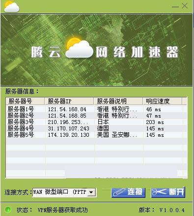騰云網(wǎng)絡(luò)加速器 v1.0.0.4綠色中文版 騰云網(wǎng)絡(luò)加速器是一款專業(yè)網(wǎng)游加速、網(wǎng)絡(luò)加速軟件,使用VPN代理技術(shù),軟件使用簡(jiǎn)單。魔獸世界延遲可控制在200ms左右,對(duì)所有網(wǎng)絡(luò)游戲、免費(fèi)網(wǎng)絡(luò)游戲都有非常顯著的效果;全面解決電信、網(wǎng)通、教育網(wǎng)、鐵通、科技網(wǎng)互聯(lián)互通問題,顯著提升網(wǎng)絡(luò)游戲連接速度