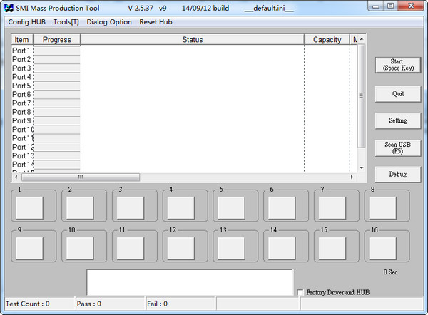 先插入U盤,然后打開量產(chǎn)工具,直接點scan按鈕就能讓量產(chǎn)工具發(fā)現(xiàn)U盤了,可以在量產(chǎn)工具窗口看到直接正確識別為SM3257ENLT,說明量產(chǎn)工具找得對。 下面就是量產(chǎn)設(shè)置了,設(shè)置密碼為空,直接回車進入,然后按下圖設(shè)置即可。