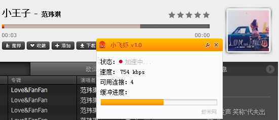 小飛蝦的功能非常簡單,就是加速緩沖,和土豆等網(wǎng)站的飛速土豆等屬于同類軟件,實測速度聯(lián)通10M網(wǎng)絡(luò)情況下速度在1M-1.5M左右,基本在5-6秒以內(nèi)緩沖完成一首歌。