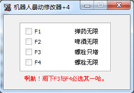 F1彈藥無(wú)限F2啤酒無(wú)限F3螺栓只增F4螺栓無(wú)限